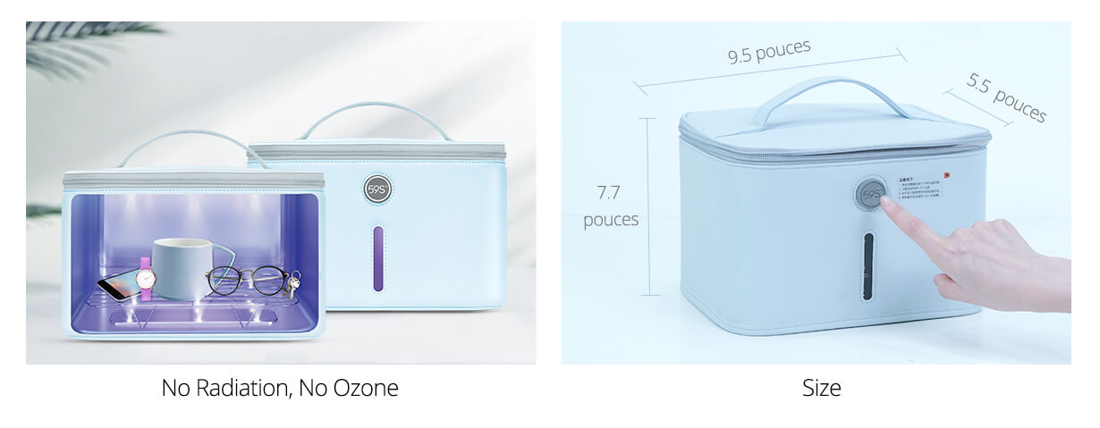 - 4. PROTECTION & SAFETY DESIGN - Zip up the bag, click the button, and clearly see the purple light trough transparent area in cleaning mode, no light leak out.