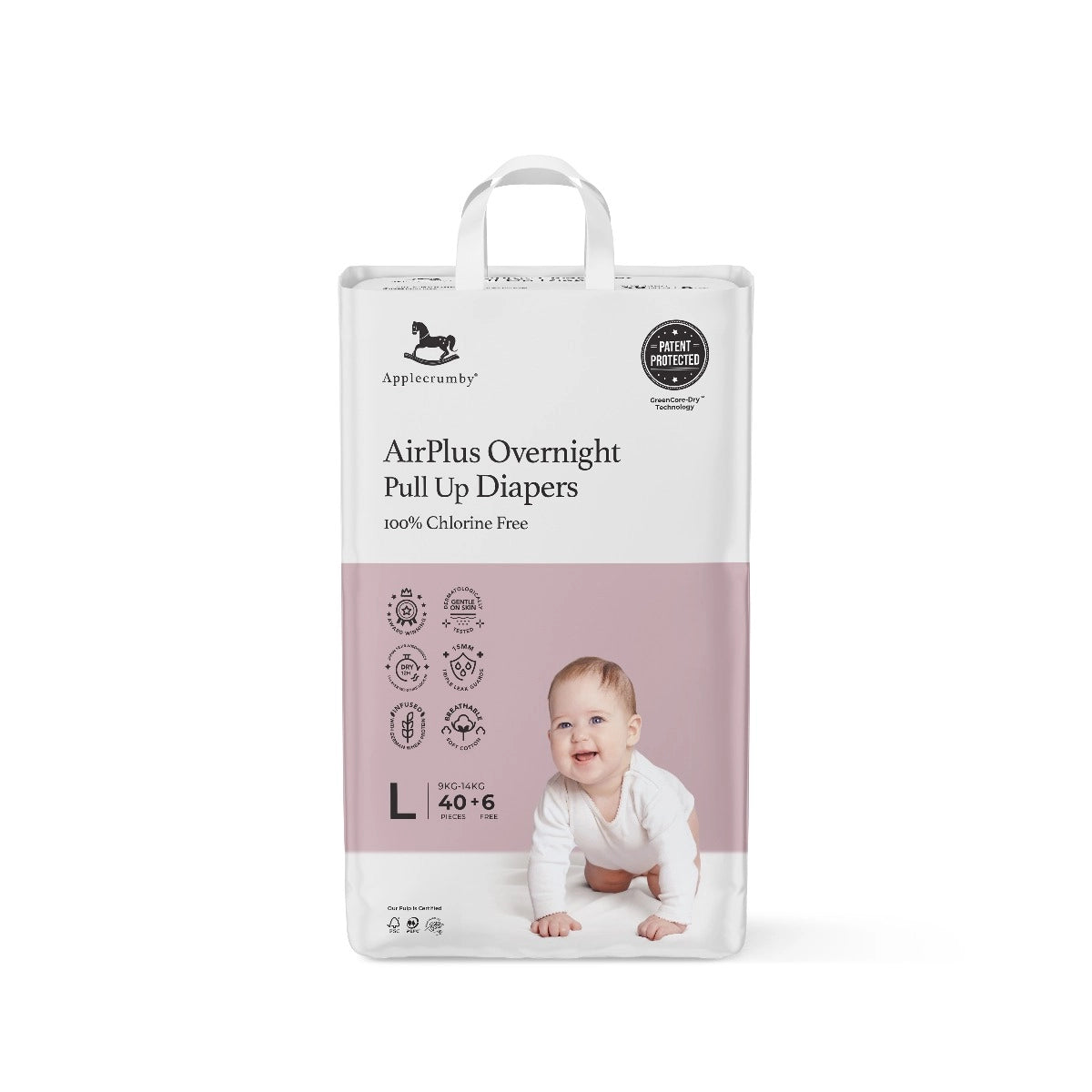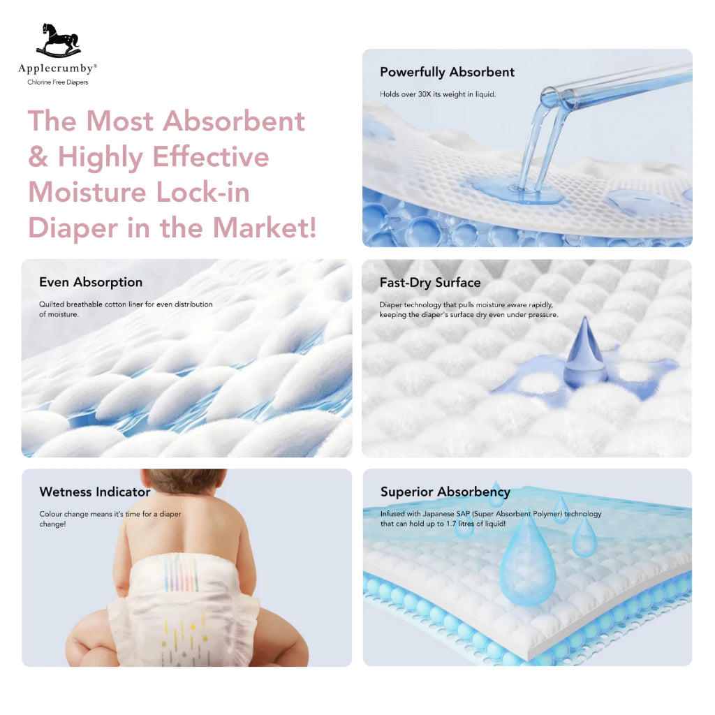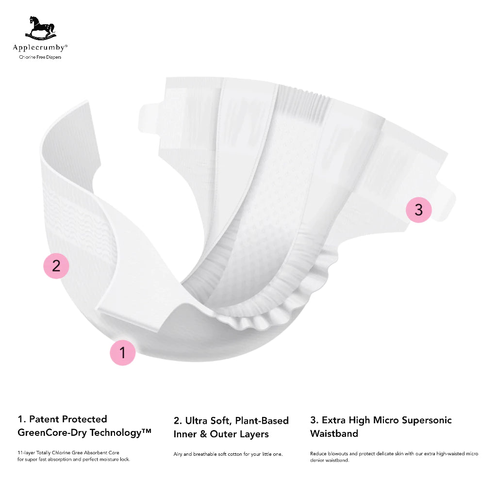 Applecrumby diapers are Patent Protected 100% CHLORINE FREE, making it friendly to your baby’s bottom and the environment!
