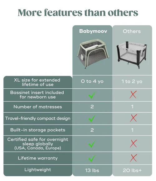 In summary, it's the perfect travel cot: a raised crib for babies up to 6 months, and a large travel cot for toddler. You'll be fully equipped for trips out with your child, with somewhere comfortable for them to sleep and play! This makes Moov & Comfy one of the best travel cribs on the market.