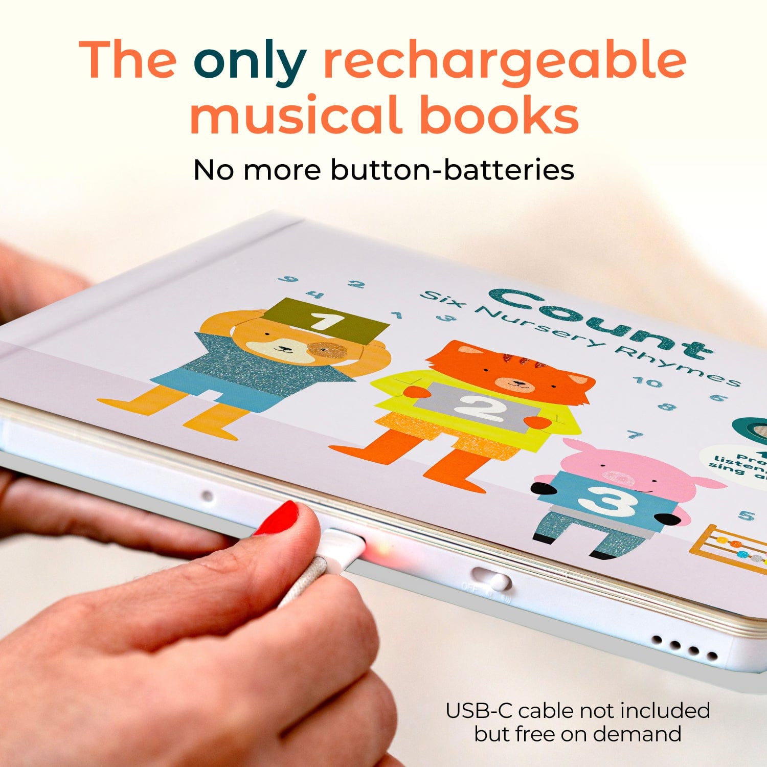 Introduce counting to your child with the Count With Nursery Rhymes sound book! Fun nursery rhymes such as "One, Two, Buckle My Shoe" and "Five Little Birds" engage kids in a rhythmical learning format that guarantees smiles and laughter. Popular songs included in this book are Five Little Monkeys, One, Two, Three, Four, Five, and Ten Green Bottles. Let your little one explore the exciting world of numbers in a fun and educational way! Enhanced with a new volume control, improved speaker quality, and a fast, rechargeable battery for extended play.