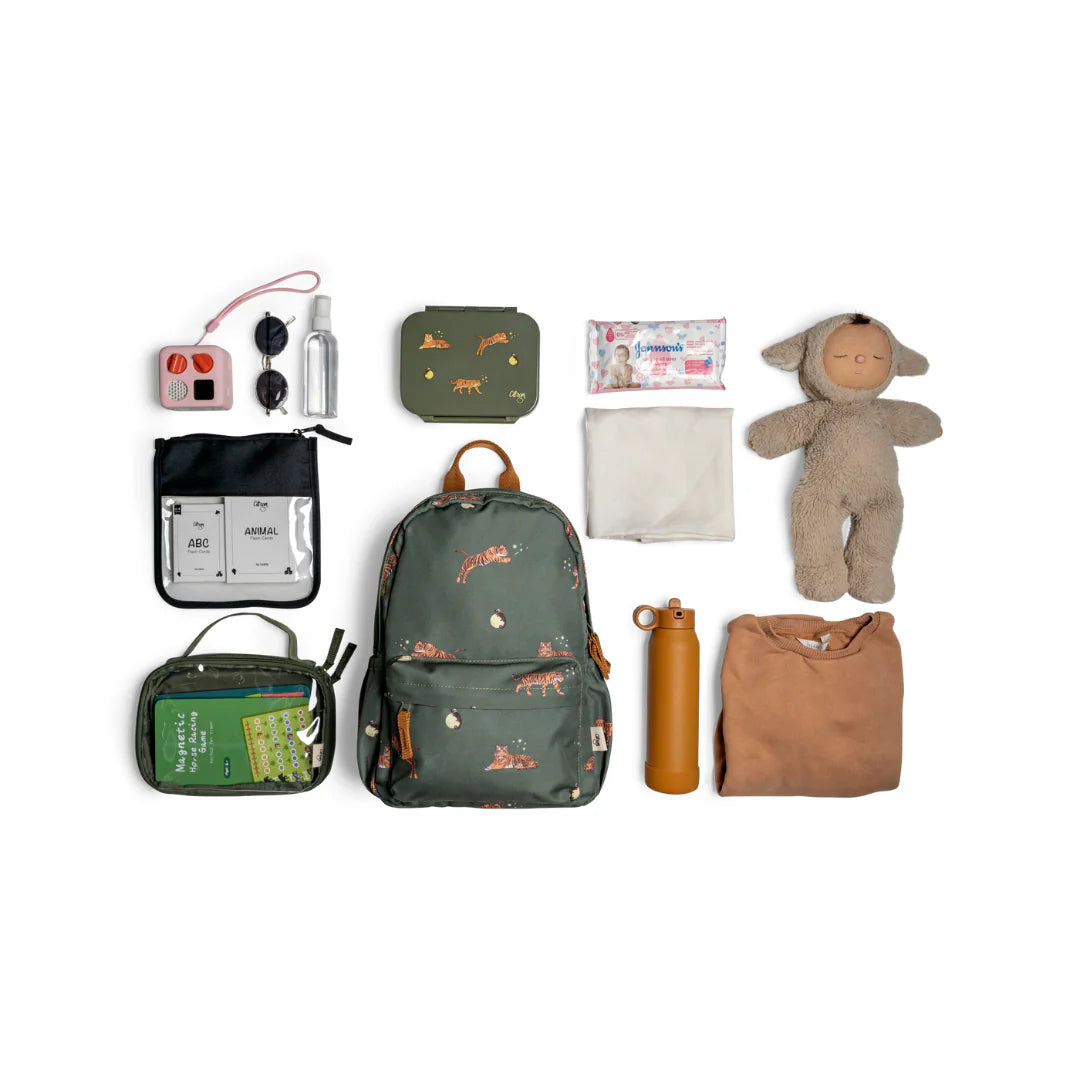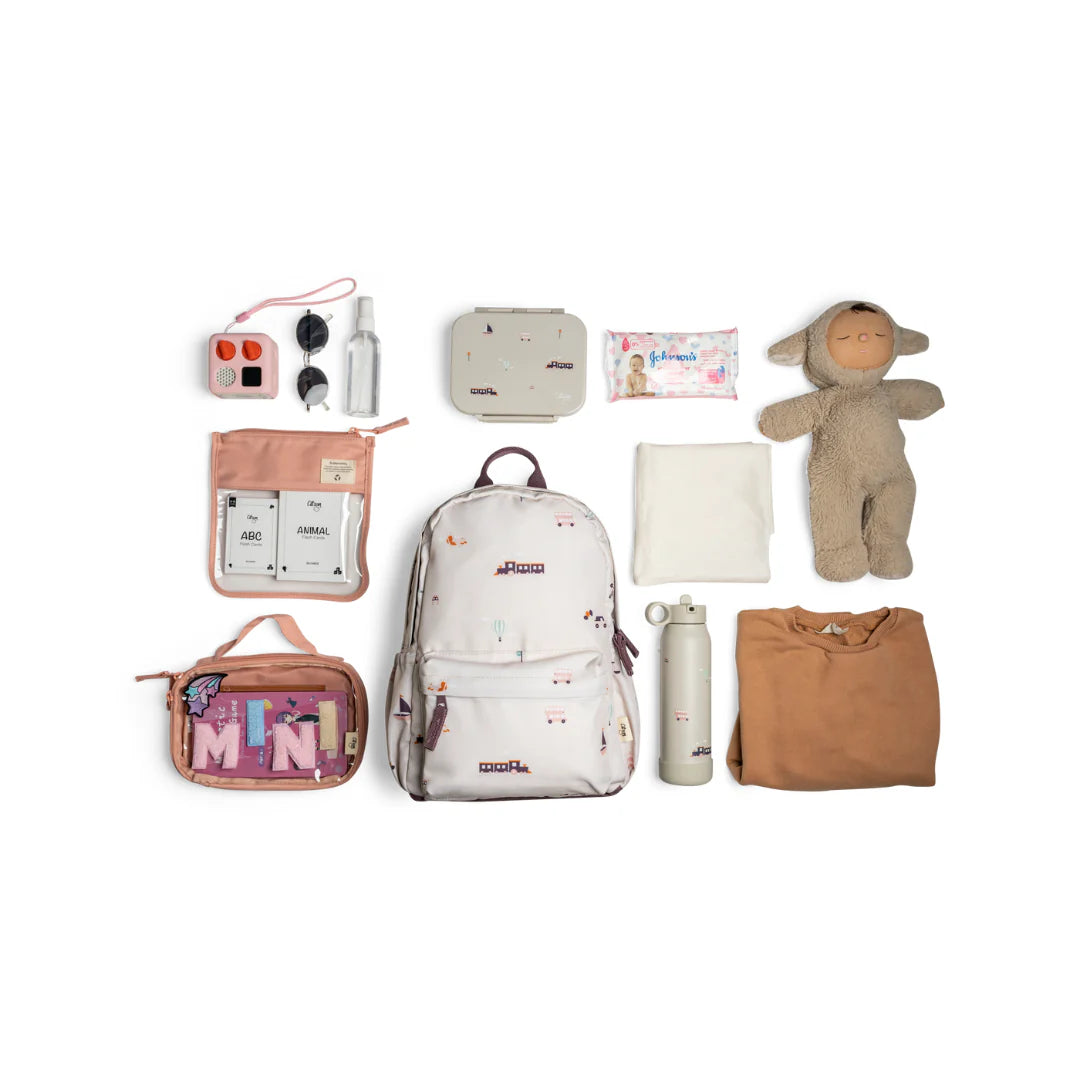 This spacious and light weight Medium Backpack has a main compartment with double-zipper closure and front zipper pocket, so it is perfect for day trips and travelling over the summer for growing kids. It can fit 2 up to 500ml water bottles, 1 Tritan snack box, wet wipes, 1 small sized toy, 1 medium sized toy, kids sunglasses, 1 standard sized toiletry, 1 small clear zipper pouch for accessories, 1 kids storage pouch or IPAD (up to 12.9 inches) and a change of clothes.