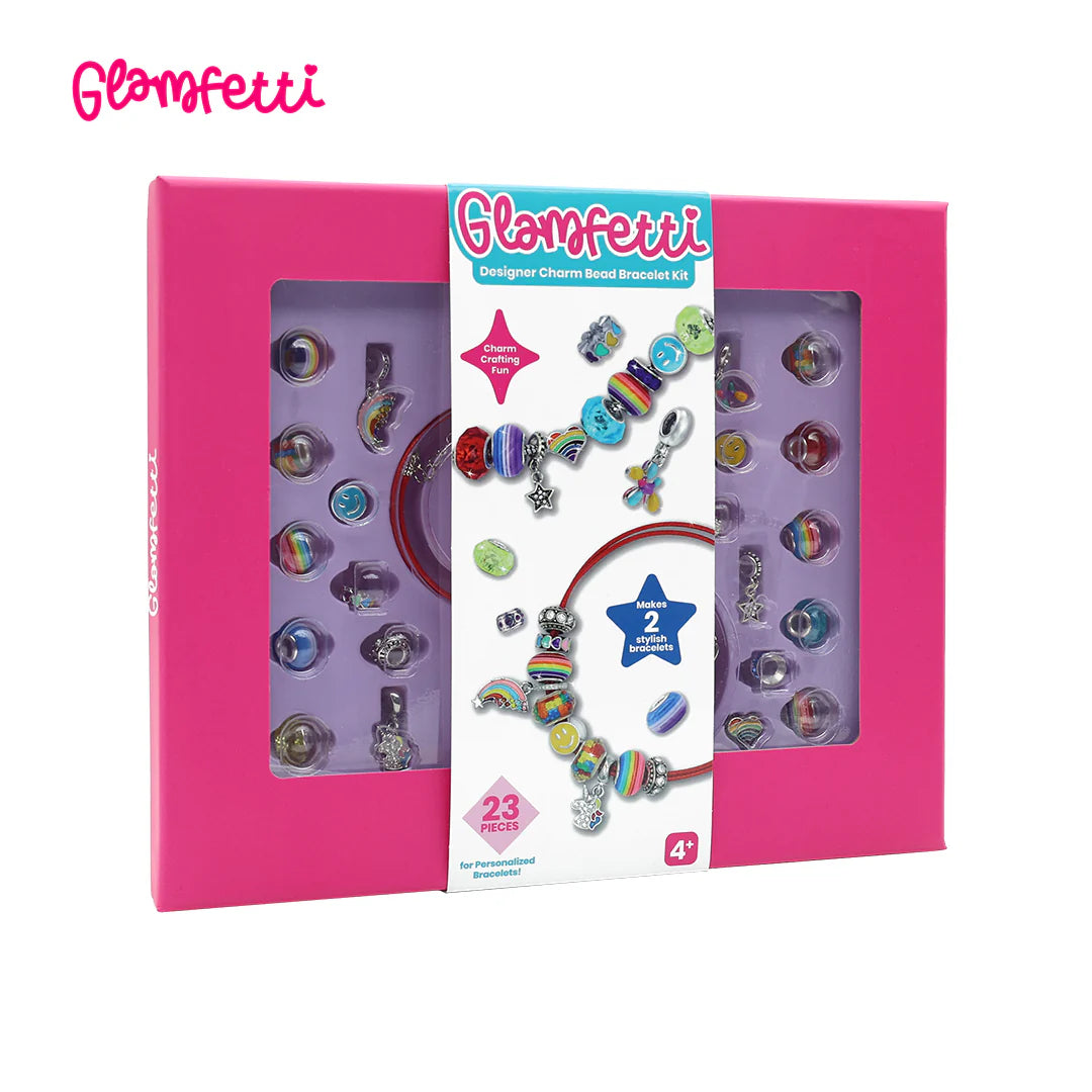 Design, string, and wear your very own stylish charm bracelets with the Glamfetti Designer Charm Bead Bracelet Kit! Packed with 23 premium beads, this kit allows kids to mix and match vibrant colors, adorable charms, and trendy beads to create two unique bracelets.