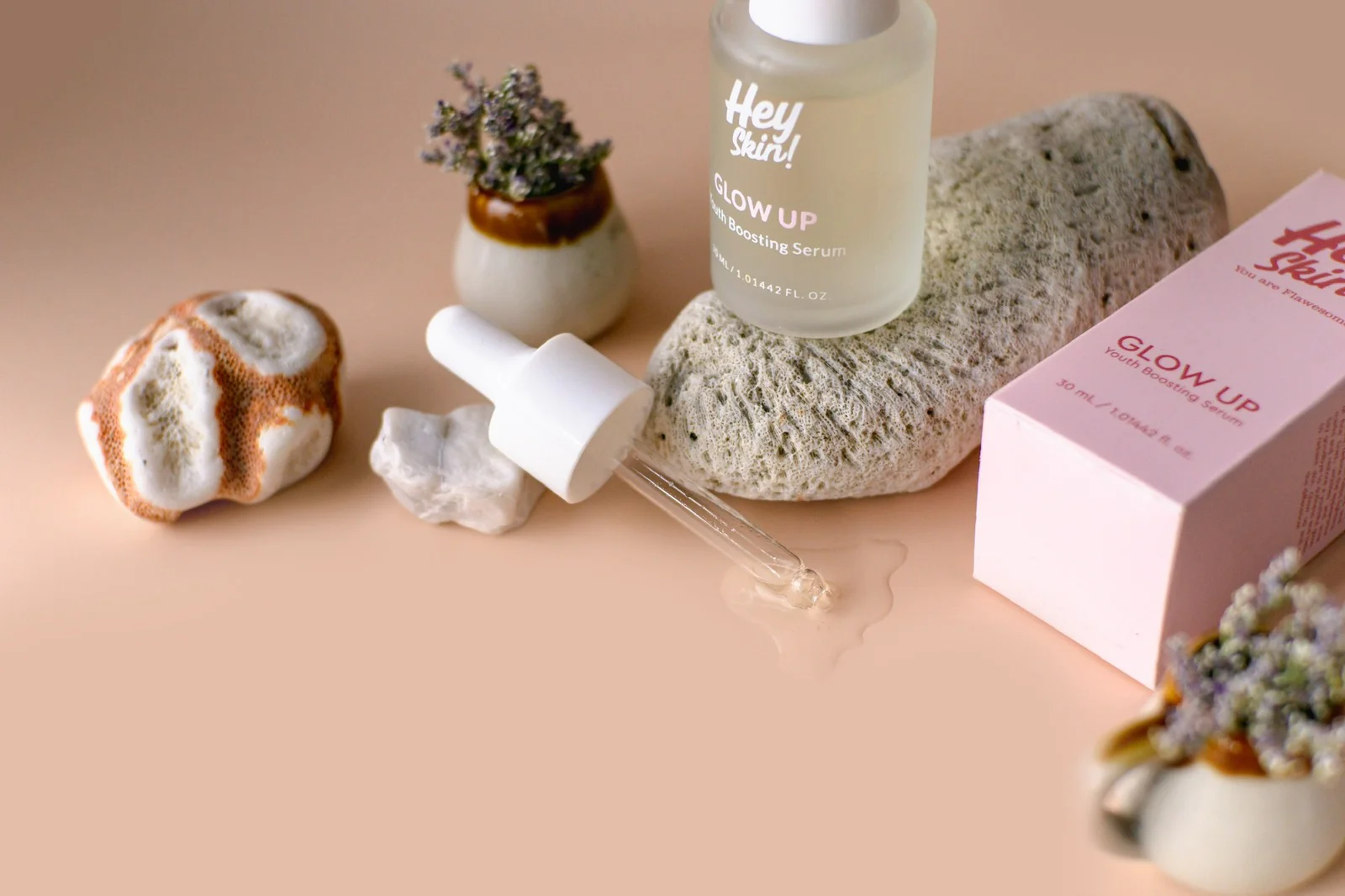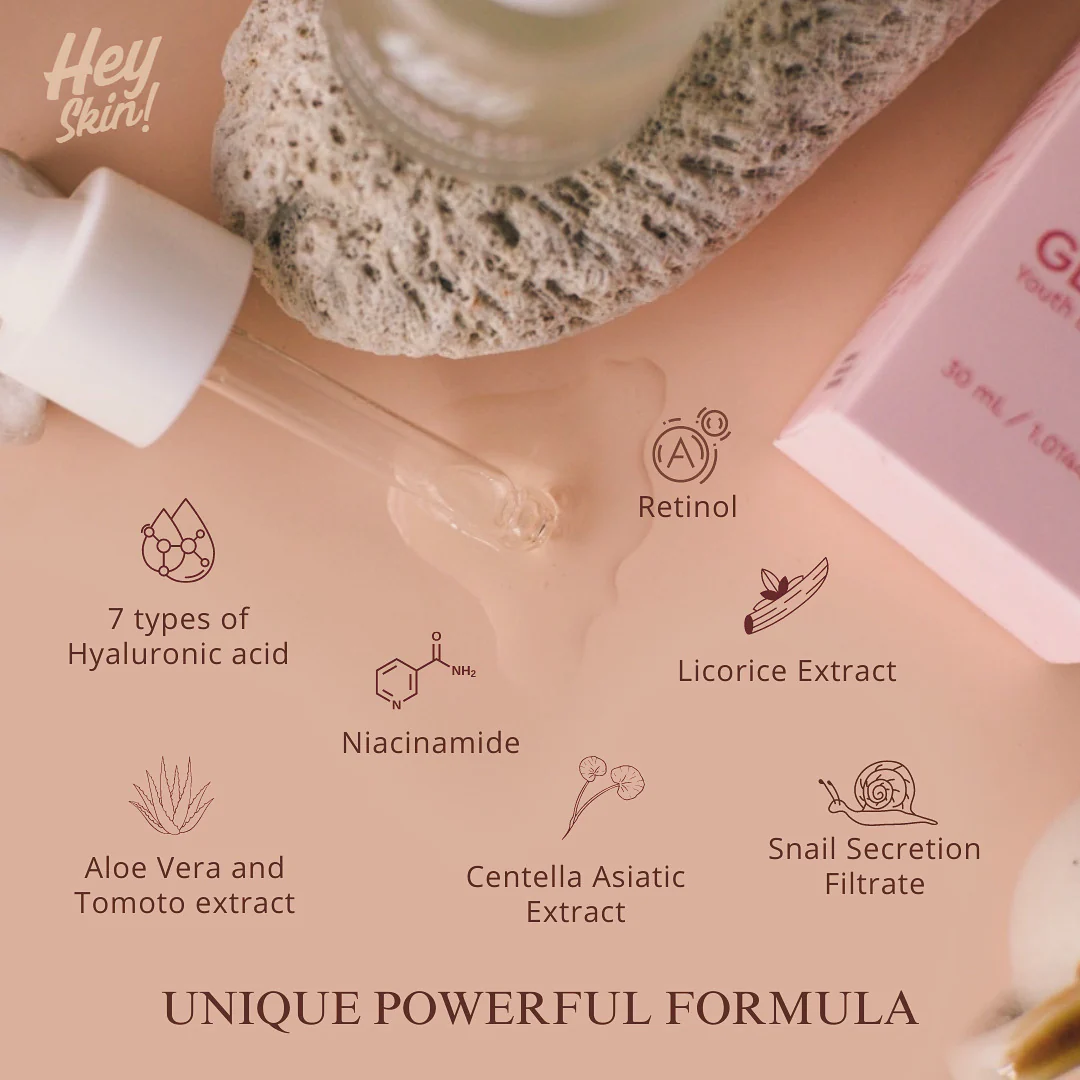 Hey Skin Glow Up Serum has a unique powerful formula that is loaded with 7 types of Hyaluronic acid, Niacinamide, Aloe Vera and Tomato extract that helps lightens dark spots, reduce the appearance of fine lines, wrinkles and acne marks and restore a youthful glow. Say goodbye to dullness and hello to radiant skin. Glow up and see the difference!