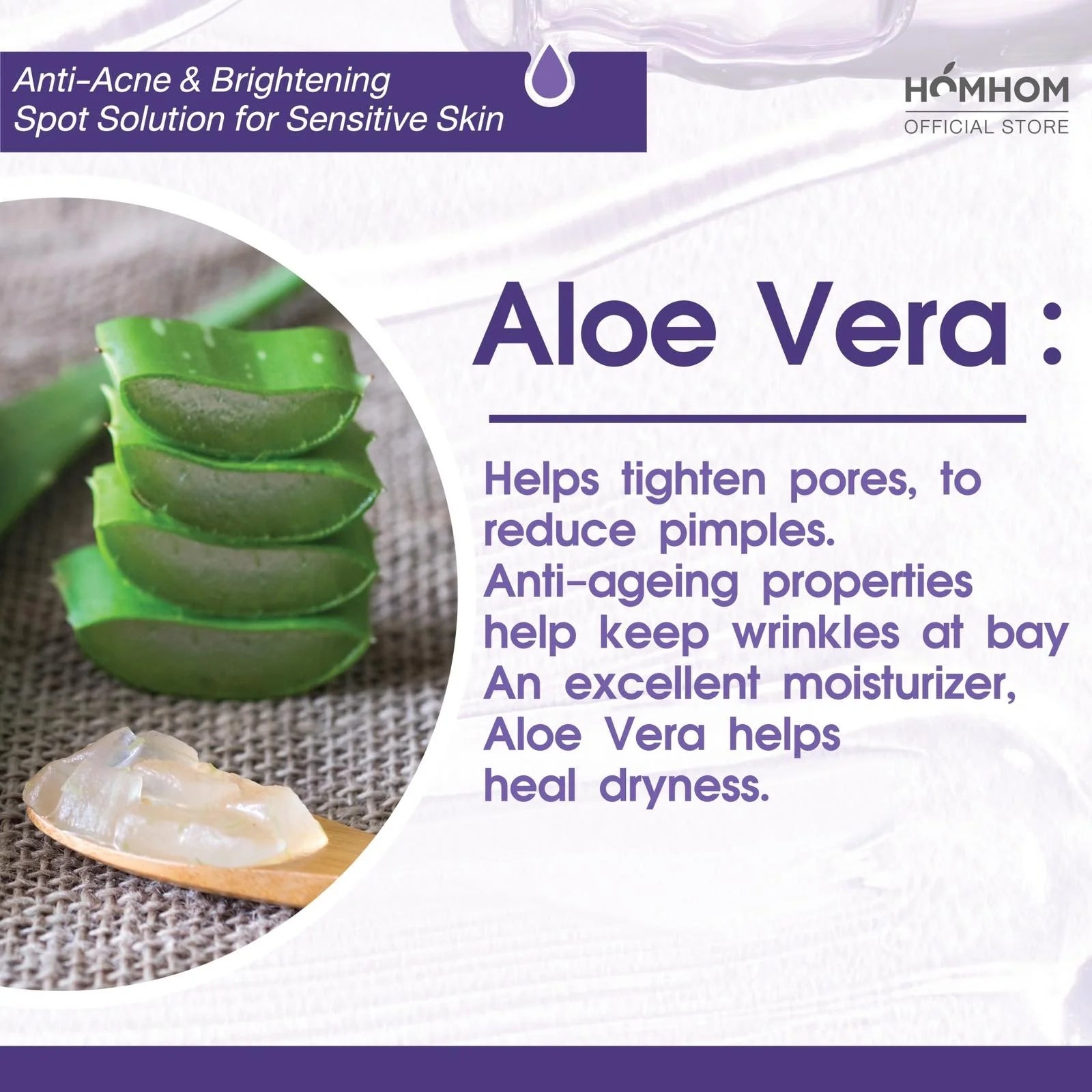 - Aloe vera : Calms irritated skin and reduces redness