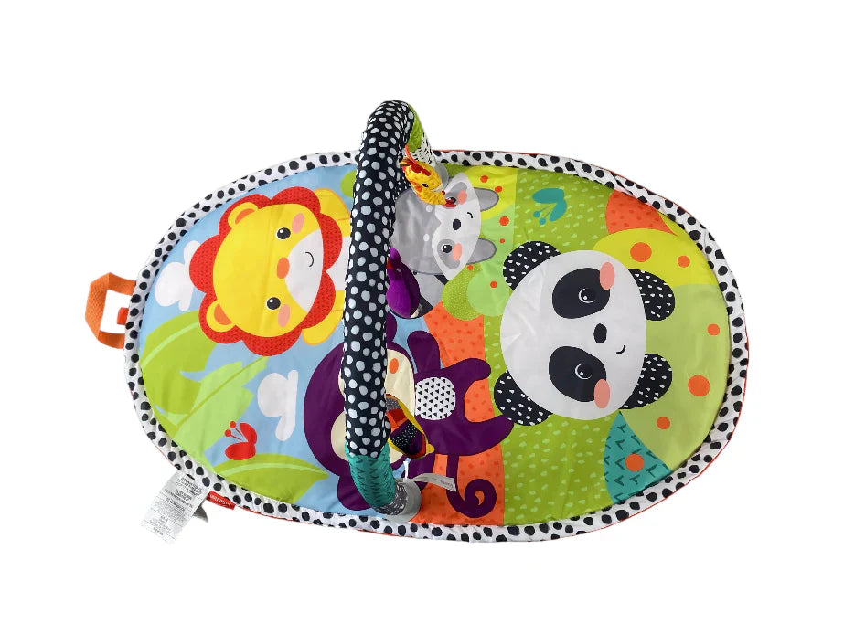 The Infantino Explore & Store Activity Gym - Jungle Friends is a lightweight and portable play gym that conveniently folds for travel, complete with handles for easy carrying. Designed to support your baby's development, it includes interactive toys such as clacker rings, crinkle fabrics, and a BPA-free teether, encouraging grasping, reaching, and batting activities. Featuring a soft mat and three hanging toys, it is suitable for newborns and beyond. Safety-certified and free from BPA, phthalates, mercury, and lead, this activity gym ensures a worry-free playtime. For easy maintenance, it can be cleaned with soap and water, and UV-light sterilization is safe when used correctly.