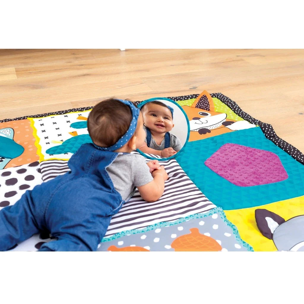 From tummy time to their first steps - this extra thick activity mat creates a safe, soft place for little ones to play at home or while out and about. The multi-textured fabrics provide early sensory interaction and built in activities encourage grow-with-me play. Creates over 20 square feet of padded play space anywhere. High contrast colors promote visual development. Features 6 activities such as a peak and play elephant, self discovery mirror, and interesting textures for tactile exploration.
