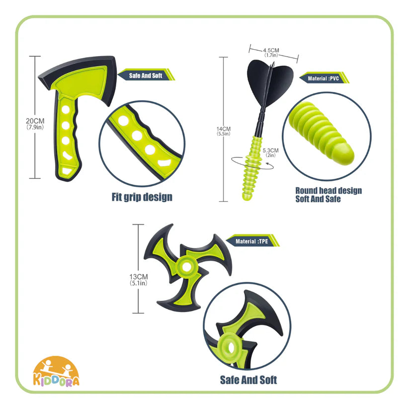 - 4-in-1 Play: Switch up the action with stars, axes, darts, and archery – all in one compact, safe, and fun set.