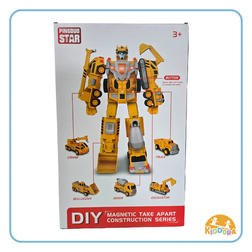 This 5-in-1 Magnetic Construction Transformer Robot is a versatile and dynamic toy that transforms between five different construction vehicles - truck, excavator, crane, mixer and bulldozer, into one giant robot! The magnetic connectors allow for easy assembly and disassembly, making it perfect for creative construction play.