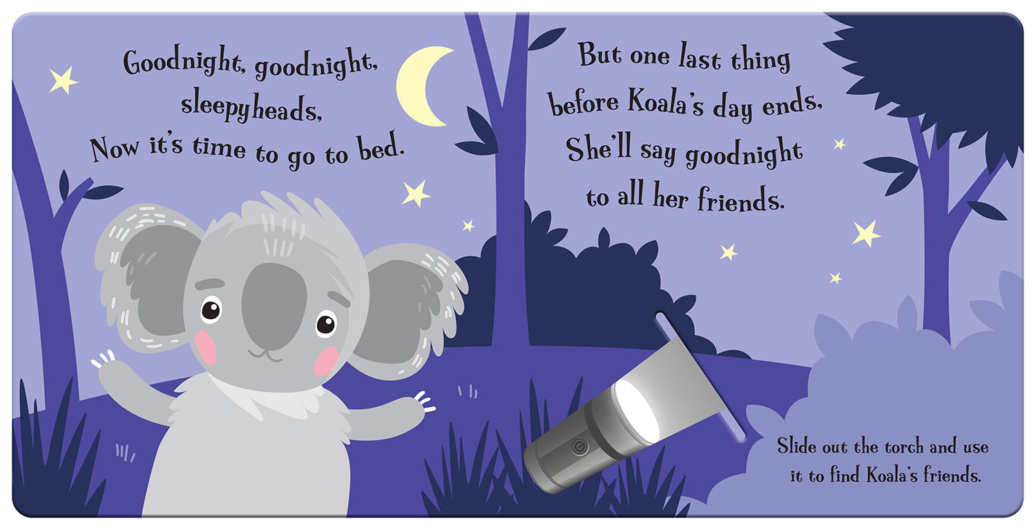 A magical bedtime story book for children. Bear is ready for bed, but first she wants to say good night to all her animal friends. Insert the magic flashlight between the pages to find