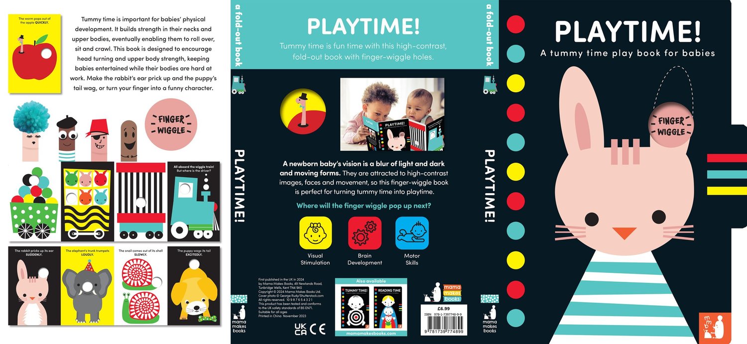 Playtime! is a high-contrast fold-out book with finger wiggle holes to encourage key developmental skills while you have fun together.