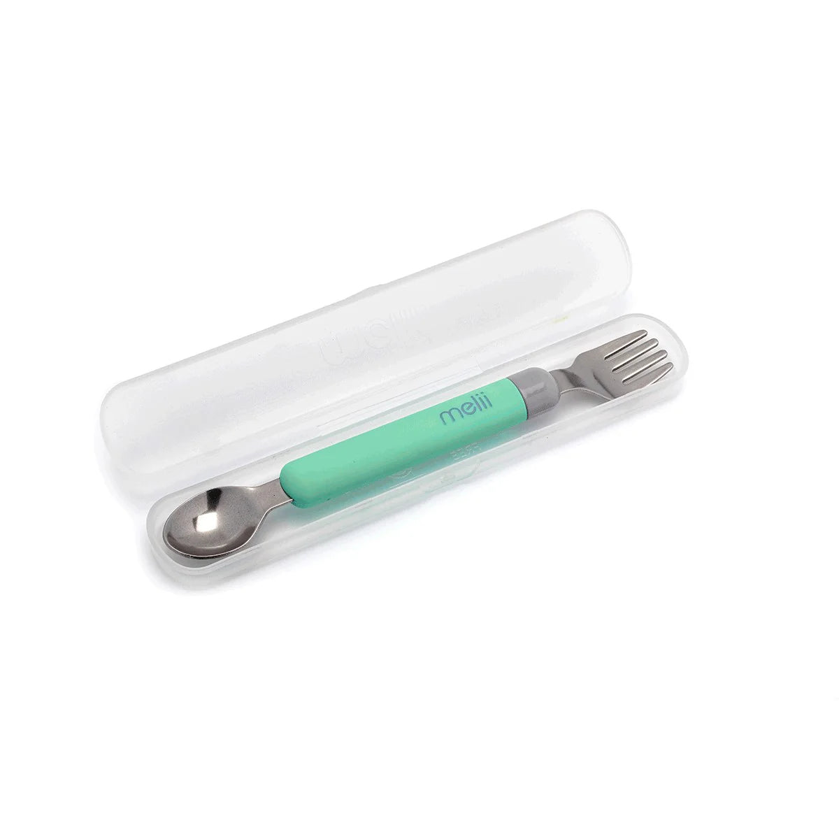 Use the stainless steel spoon and fork together or separately. Designed to feed little mouths and be held by little hands.