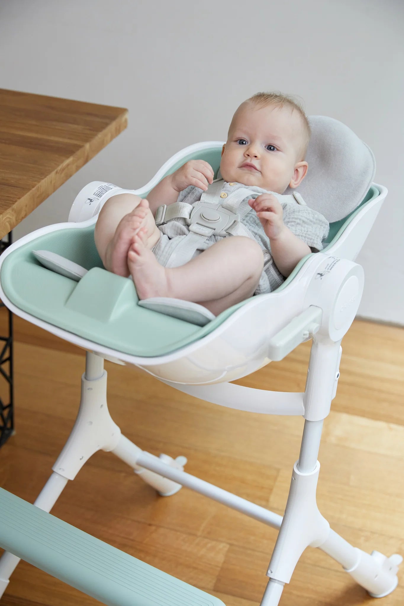 The detachable pillow provides head support while feeding and lumbar support when they are older.