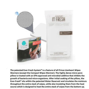Specially designed to accompany the Prince Lionheart Wipes Warmer of your choice, the Ever-Fresh® Pillow will help keep your wipes moist longer than ever. Simply place your saturated Ever-Fresh Pillow at the bottom of your baby wipes warmer. The pillow helps keep the wipes moist and fresh, fighting off bacteria with the EPA-approved anti-microbial additive within the Ever-Fresh Pillow, all while preventing the bottom of your wipes warmer from browning. By the way, browning is normal and expected. It is not burning. It is the result of the oxidation process when wipes with various additives are warmed, similar to an apple that oxidizes and turns brown once it is cut; it is safe to eat, just a little unsightly.