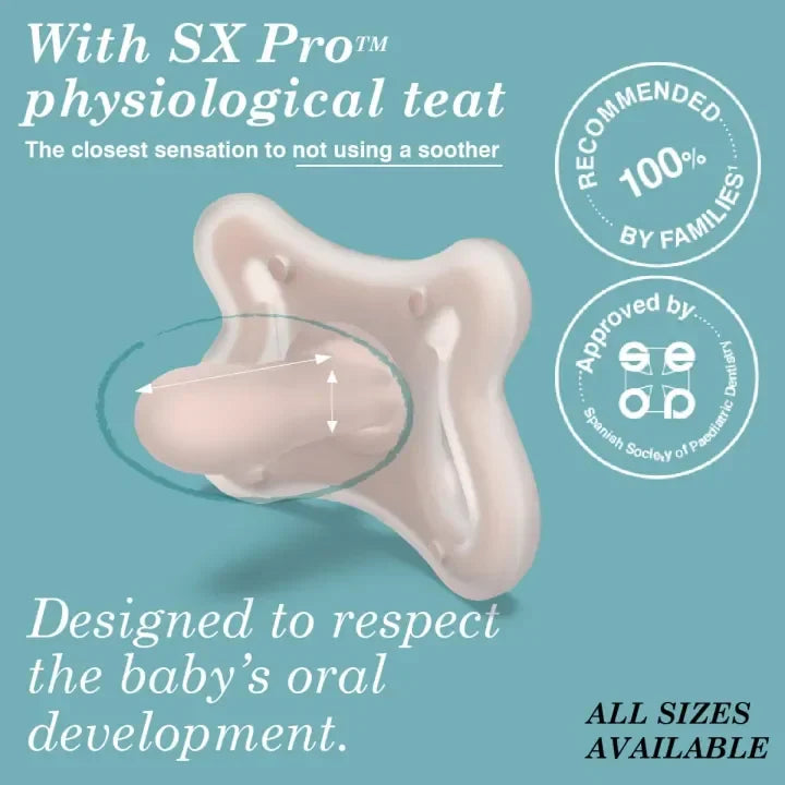 SX Pro™ Physiological Nipple: The nipple is designed to support the tongue’s natural position during breastfeeding, promoting proper alignment of the mouth, tongue, and jaw for healthy oral development.