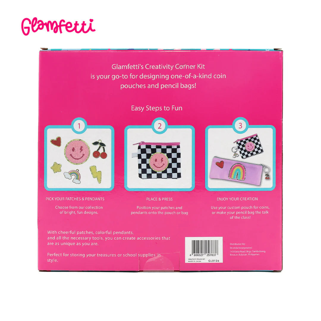 Product Description: Unleash your creativity with the Glamfetti Creativity Corner Coin Pouch & Pencil Bag Kit. This all-in-one kit allows kids to design and personalize two unique pouches—one for coins and one for pencils. With a fun assortment of patches, pendants, and easy-to-follow instructions, this kit is perfect for expressing individuality and style.