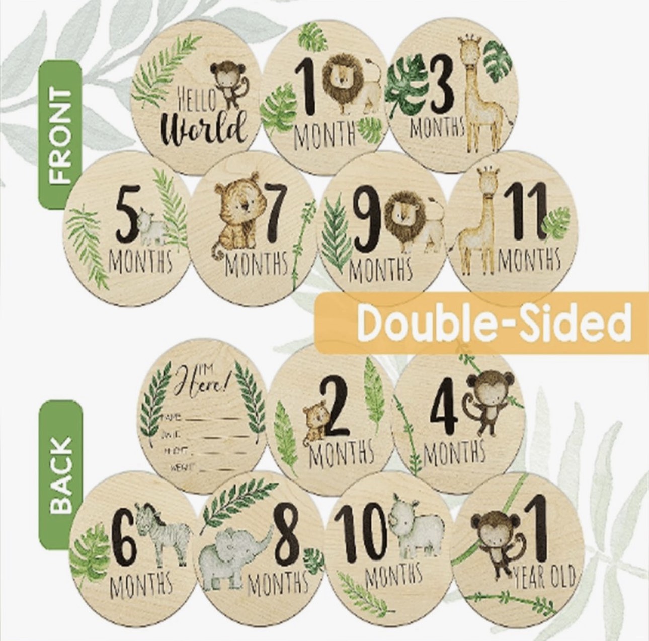• SAFARI SET includes 7 wooden double-sided discs with Hello World, I’m here, months 1-11, and 1 year prints.