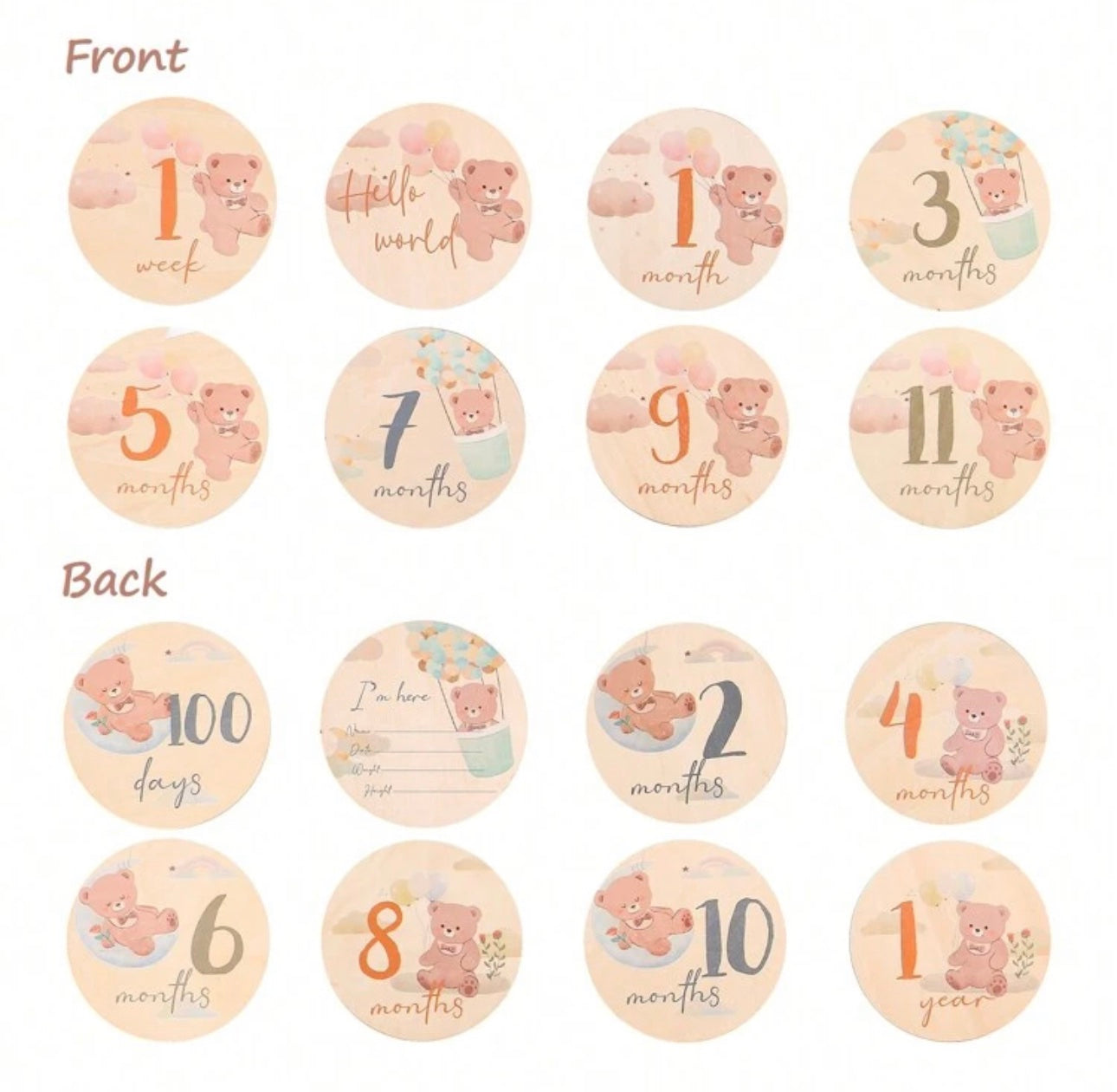 • BEAR SET includes 8 wooden double-sided discs with Hello World, I’m here, 1 week, 100 days, months 1-11, and 1 year prints.